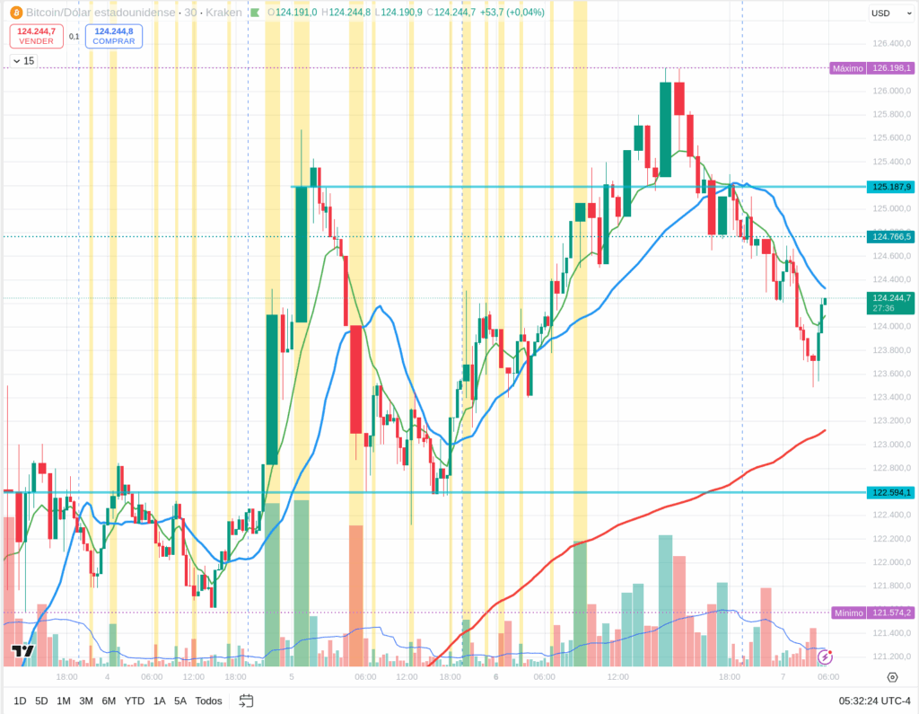 - Bearish Rejection: Long upper wicks on candles approaching $126,000 show that sellers are defending the zone. This could trigger a reversal back toward the $124,000 support.