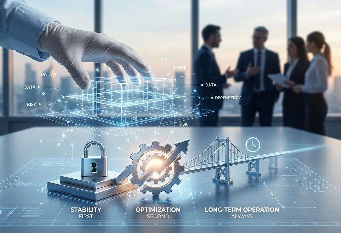 Antes de intervenir en cualquier sistema, nos centramos en comprender los riesgos, las dependencias y el impacto en el negocio. Nuestro trabajo se rige bajo la premisa de priorizar la estabilidad, seguida de la optimización y, siempre, la operativa a largo plazo.