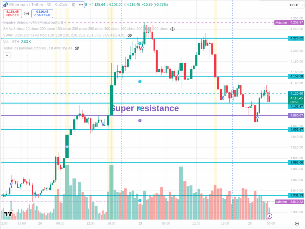 Ethereum, at $4,118, is undergoing the expected retest of its former “super-resistance” at $4,080.