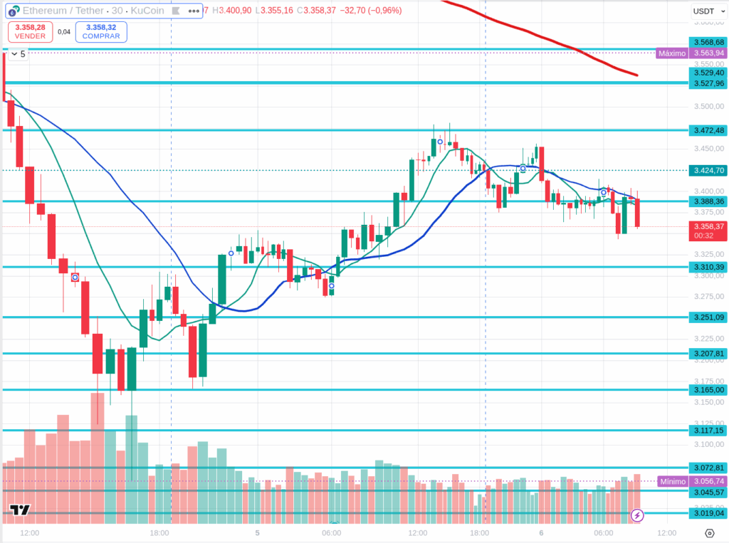 Ethereum, at $3,358, has fallen hard from its high (near $3,478) and is back in a very vulnerable position.