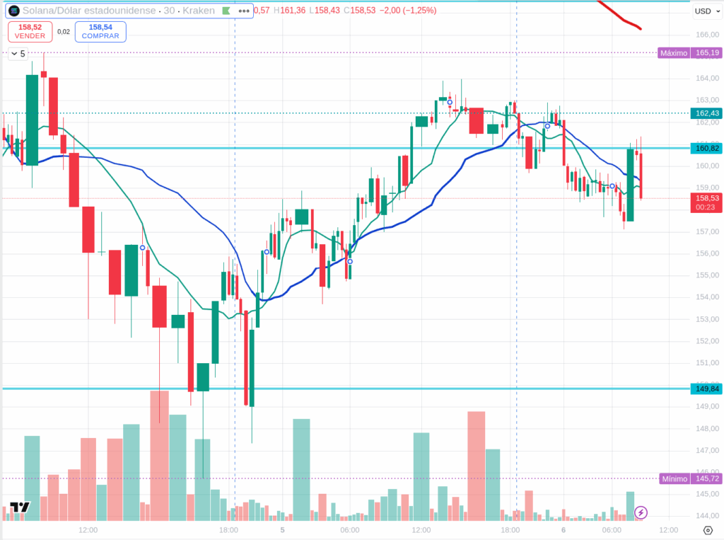 What to Watch: * SOL is back in the lower half of its daily range. Its bounce was fast, and its rejection is equally fast. * The $154-$155 low is the key level to watch. A break here would signal a clear continuation of the downtrend. * Indicators: RSI (30m) is likely weak (below 50). The MACD is probably showing a failed bullish attempt.
