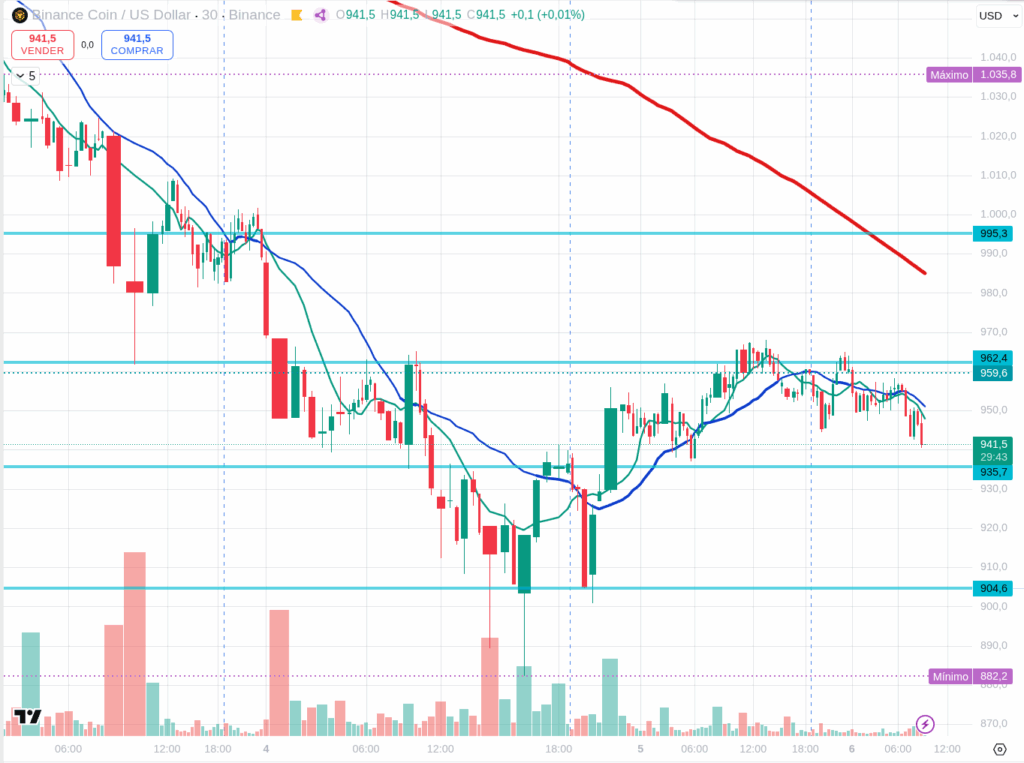 BNB, at $940, has also pulled back sharply from its high near $967, now testing its intraday support.
