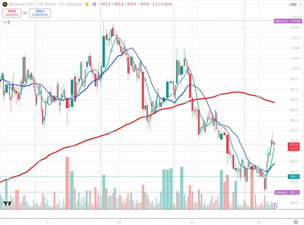 What to Watch: * BNB looks very constructive, similar to ETH. It’s holding its pivot zone as support. * The RSI (30m) is likely in the healthy 50-60 range, and the MACD (30m) is probably showing a clean bullish turn. * If it can hold above $970, a test of $985 and the $1,000 level is the natural short-term objective.