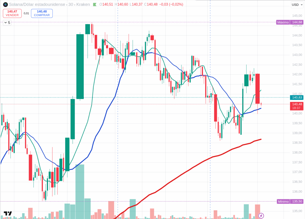 - Support: $138 – $140. SOL must hold this zone to avoid a deeper drop towards previous lows.