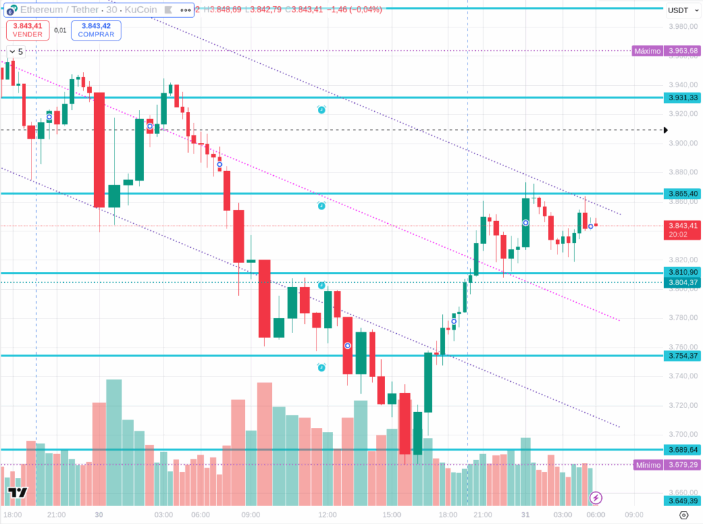 Ethereum, at $3,845, is testing if it can stay above $3,810, still far from its daily SMA200, which suggests deeper weakness than BTC.