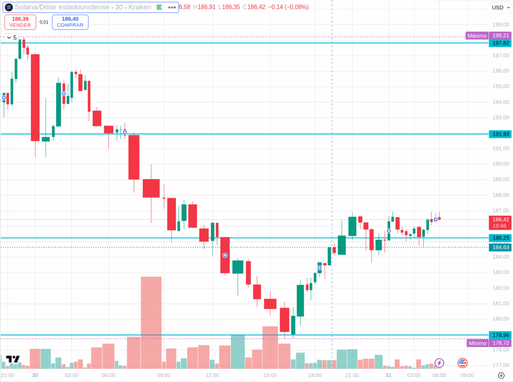 Solana, at $186.61, showed less of a dramatic pullback yesterday, but is still trading in a volatile range.
