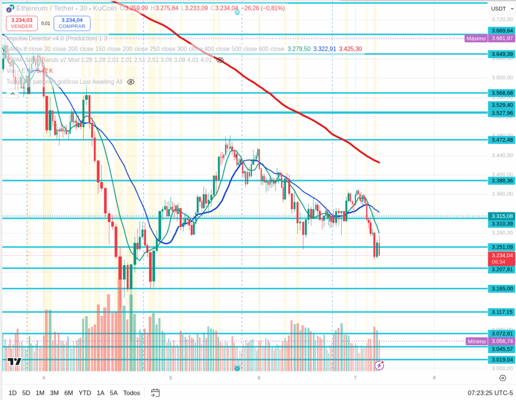 Ethereum, at $3,240, has been hit hard and is now deep in corrective territory, far below its recent highs.