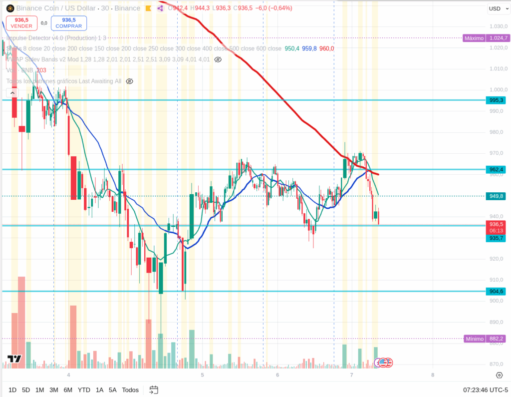 BNB, at $939, has held up better than SOL but has still broken its recent support structure.