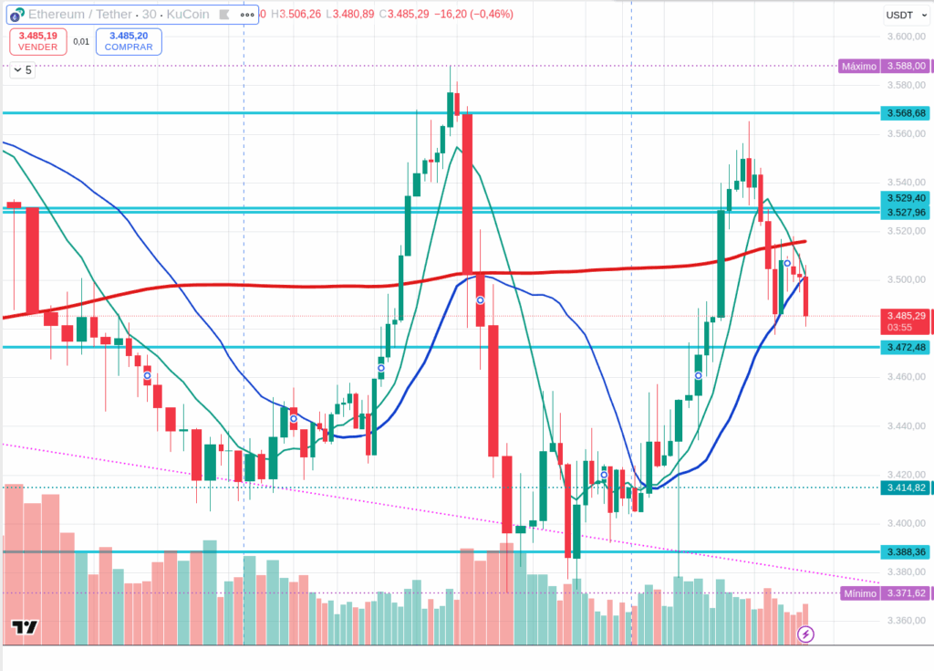 Ethereum, at $3,491, is showing slightly better relative tone than BTC but remains volatile.