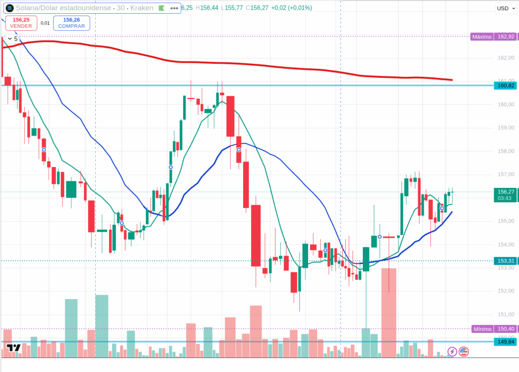 Solana, at $156.25, is behaving with its typical high beta (volatility).
