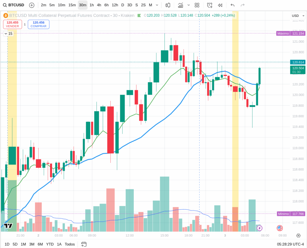 - Current Structure: Wide intraday range following an impulsive move; Today’s High/Low: 121,046 / 118,376.
